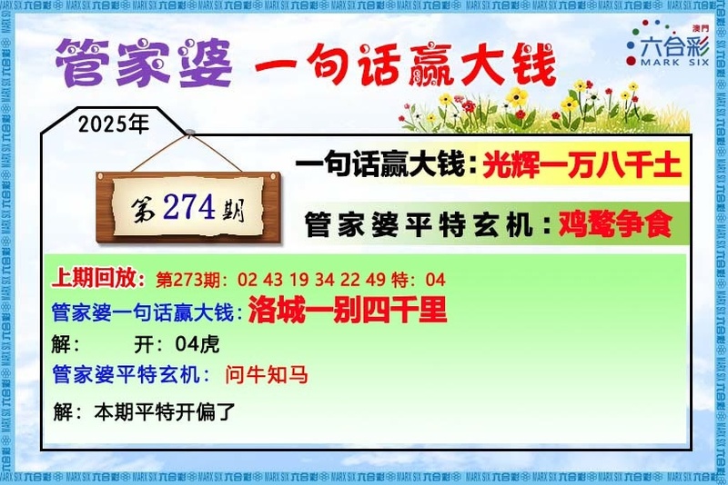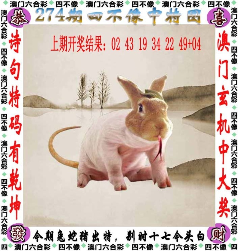 272期 本期生肖二五开,二三门看特有钱。 土木之数中特码,将军君王一声怒。 变幻莫测显神功,一举两得猪中计。 牛羊马猪中特奖,双喜临门一大篇。 |